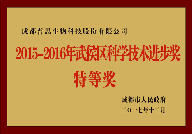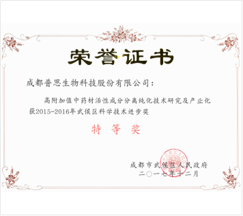 2017年 普思的科技項(xiàng)目“高附加值中藥成分分離純化技術(shù)研究及產(chǎn)業(yè)化”榮獲武侯區(qū)2015-2016年度科技進(jìn)步特等獎(jiǎng);
