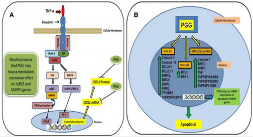 圖一 PGG在MM-231和MM-468三陰性乳腺癌細(xì)胞中的抗癌和促凋亡機(jī)制。(A) PGG抑制TNF-α刺激的CXCL1 mRNA和蛋白表達(dá),通過調(diào)節(jié)NFκB和MAPK信號(hào)通路中涉及的基因作為可能的分子機(jī)制。(B) PGG誘導(dǎo)與凋亡相關(guān)的特定基因在MM-231和MM-468三陰性乳腺癌細(xì)胞系中的表達(dá)。
