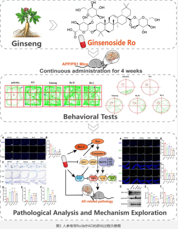 人參皂苷Ro通過減少Aβ沉積、改善神經(jīng)元凋亡和神經(jīng)炎癥,以及調(diào)控MAPK通路來實現(xiàn)改善空間探索能力、記憶認(rèn)知功能。具有開發(fā)成為AD治療藥物的潛力。[5][6]