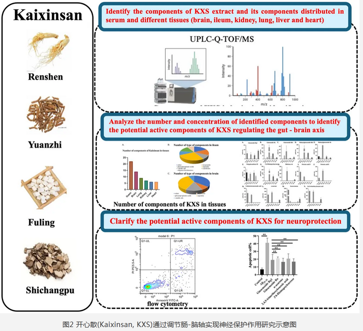 人參皂苷Ro作為開心散(Kaixinsan, KXS)的重要活性成分,通過調(diào)節(jié)腸-腦軸實現(xiàn)神經(jīng)保護作用。為KXS在防治阿爾茨海默病、抑郁癥等神經(jīng)退行性疾病中的應(yīng)用提供了理論依據(jù)。[7]